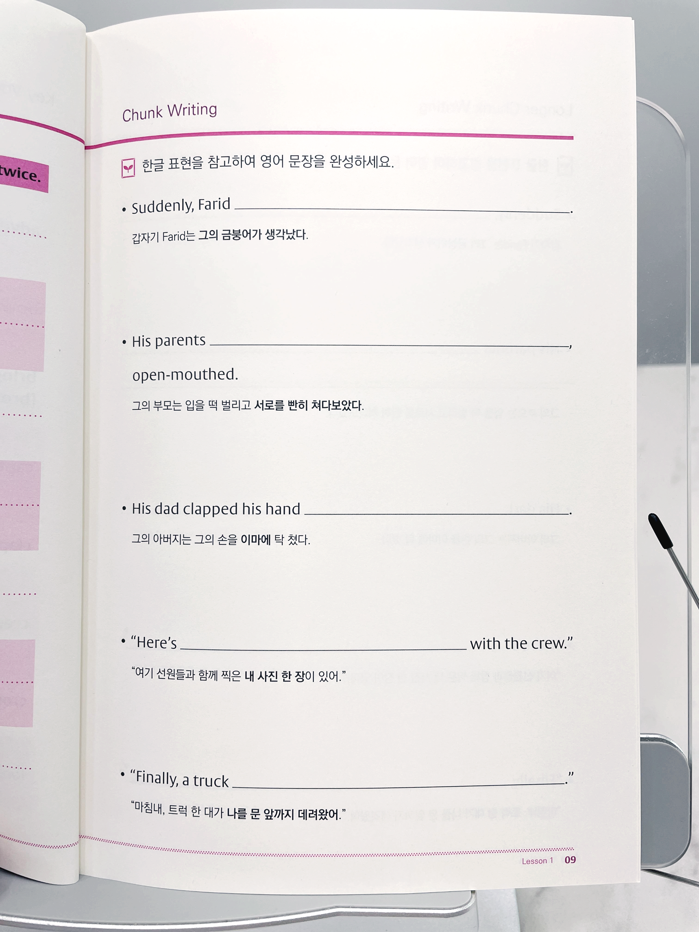 순서대로 정리하느랴 오프라인 숙제인 청크북 롸이팅이 가장 마지막에 오게 되었지만, 복습 숙제중에서는 가장 중요한 숙제입니다. 배운 레슨의 Chunk를 Chunk book 교재에 Writing 하는 숙제인데요, 보통 저는 수업을 한 당일에 해당 숙제를 하도록 시키고 있습니다.
