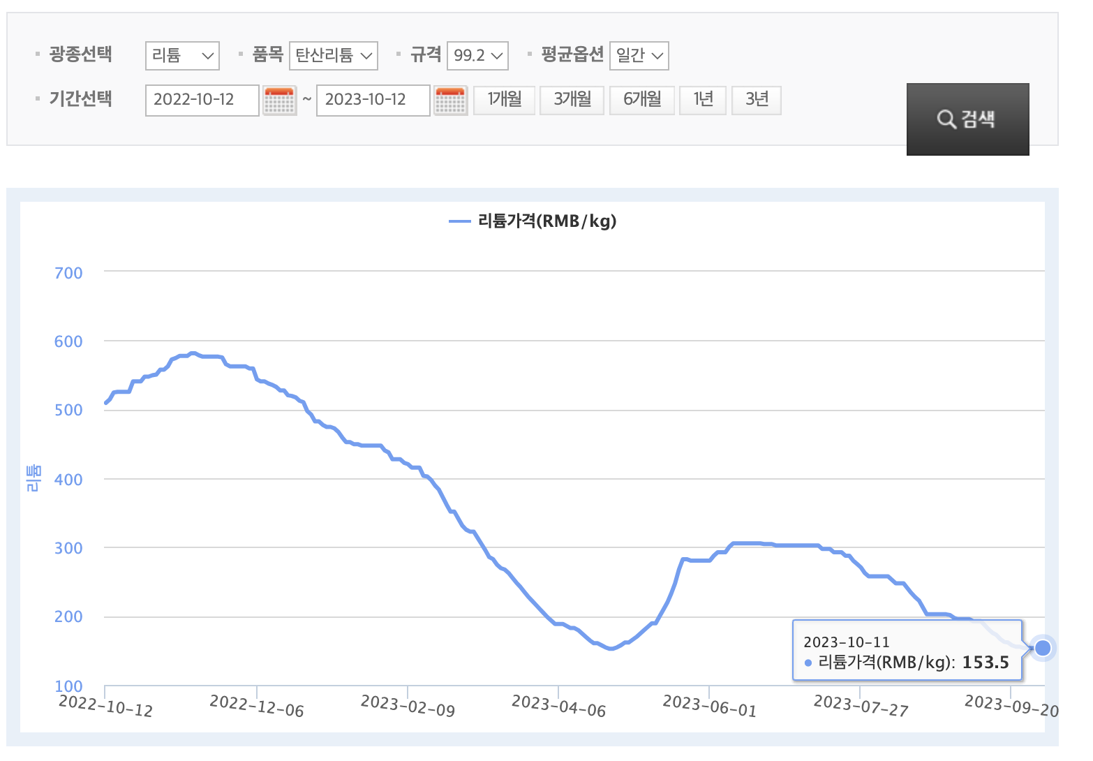 보통 리튬 가격을 설명할 때 톤당 원화보다는 달러로 비교하게 되는데요, 2023년 10월 11일 기준 kg당 21달러라니.... 리튬가격이 정말 많이 떨어지긴 했네요.ㅜㅜ