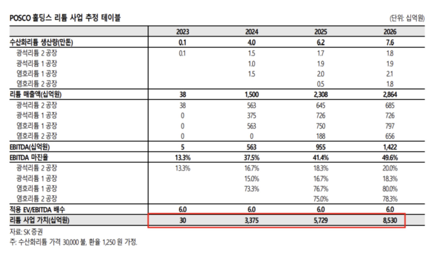 아래는 2023년 9월 4일 SK증권발표한 POSCO 홀딩스의 기업분석 보고서인데요, 수산화리튬 가격을 3만달러 기준으로 리튬 사업 가치를 추정한 것을 확인해 볼 수 있습니다. 현재 시세보다는 소폭 높긴 하지만, 향후 라튬 가격의 전망을 봤을때는 보수적으로 잡았다는 생각을 해볼 수 있습니다.