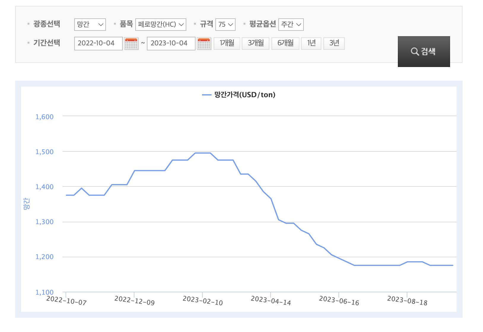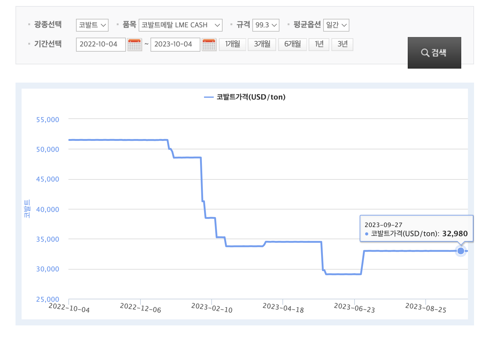 코발트, 니켈, 망간 역시 최근 1년으로 검색했을때 낮은 수준으로 확인됩니다.