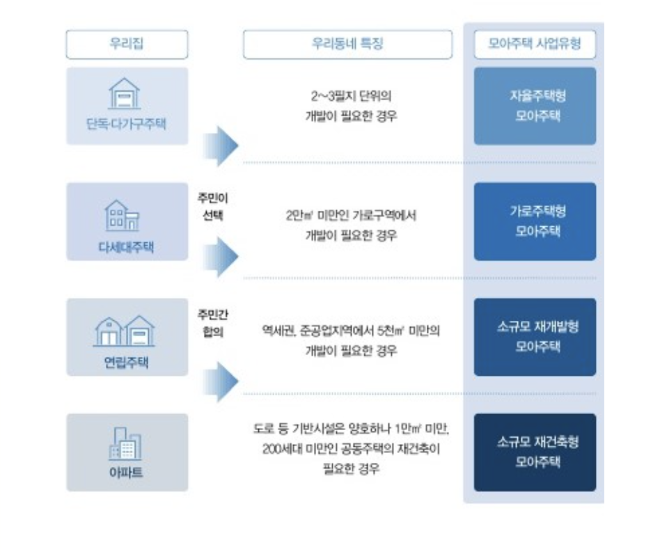 자율주택형 모아주택, 가로주택형 모아주택, 소규모재개발형 모아주택, 소규모 재건축형 모아주택 총 4가지 인데요, 소규모 택지를 전제로 하다보니 사업유형도 다양하게 나뉩니다.
