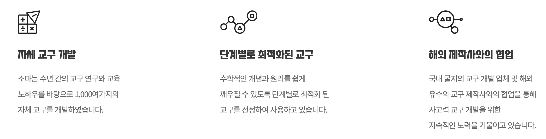 소마는 무엇보다도 창의적 사고력을 키우는 데 중점을 둡니다. 일반적인 수학 학원이 문제 풀이와 연산을 주로 다루는 반면, 소마는 아이들이 스스로 생각하고 논리적으로 문제를 해결할 수 있도록 돕습니다. 이를 위해 다양한 교구와 활동을 활용한 수업이 진행되며, 놀이처럼 재미있게 배울 수 있는 환경을 제공하려고 노력하는것 같습니다.