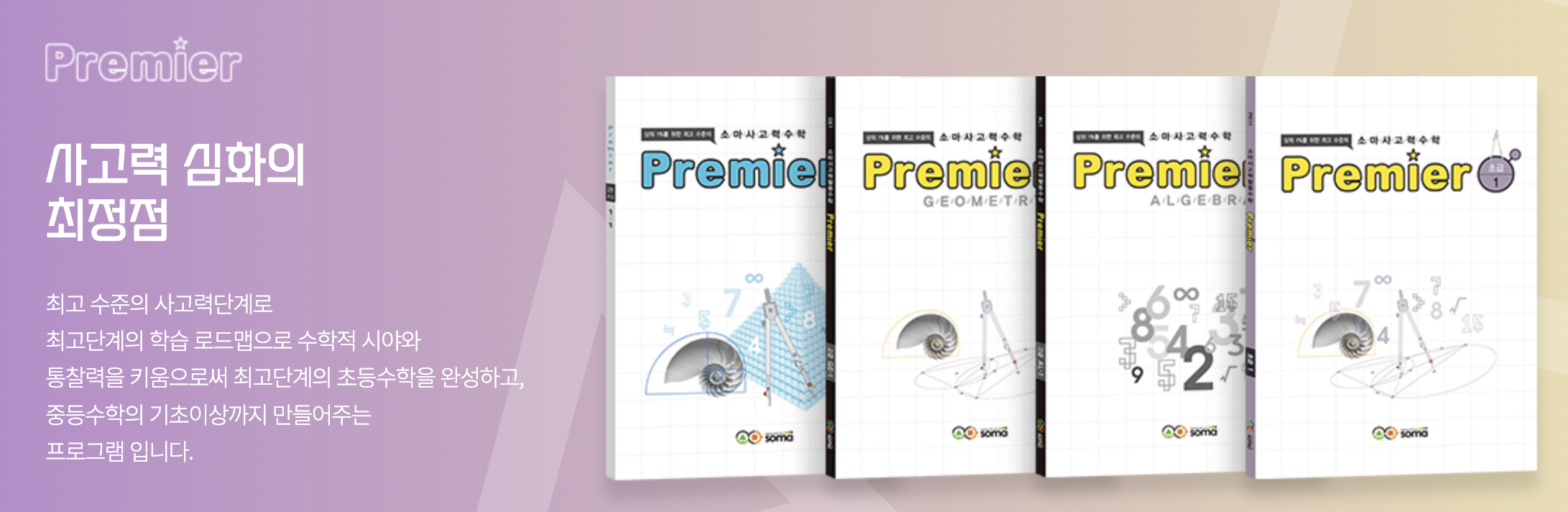 소마에는 상위 과정인 프리미어반도 있습니다. 이 반은 주 2회 수업으로 진행되며, 하루는 사고력 수학, 다른 하루는 교과 수학을 다룹니다. 프리미어반에서는 보다 심화된 문제를 빠른 진도로 학습하며, 고급 수준의 문제 해결 능력을 기르는 데 중점을 둡니다.