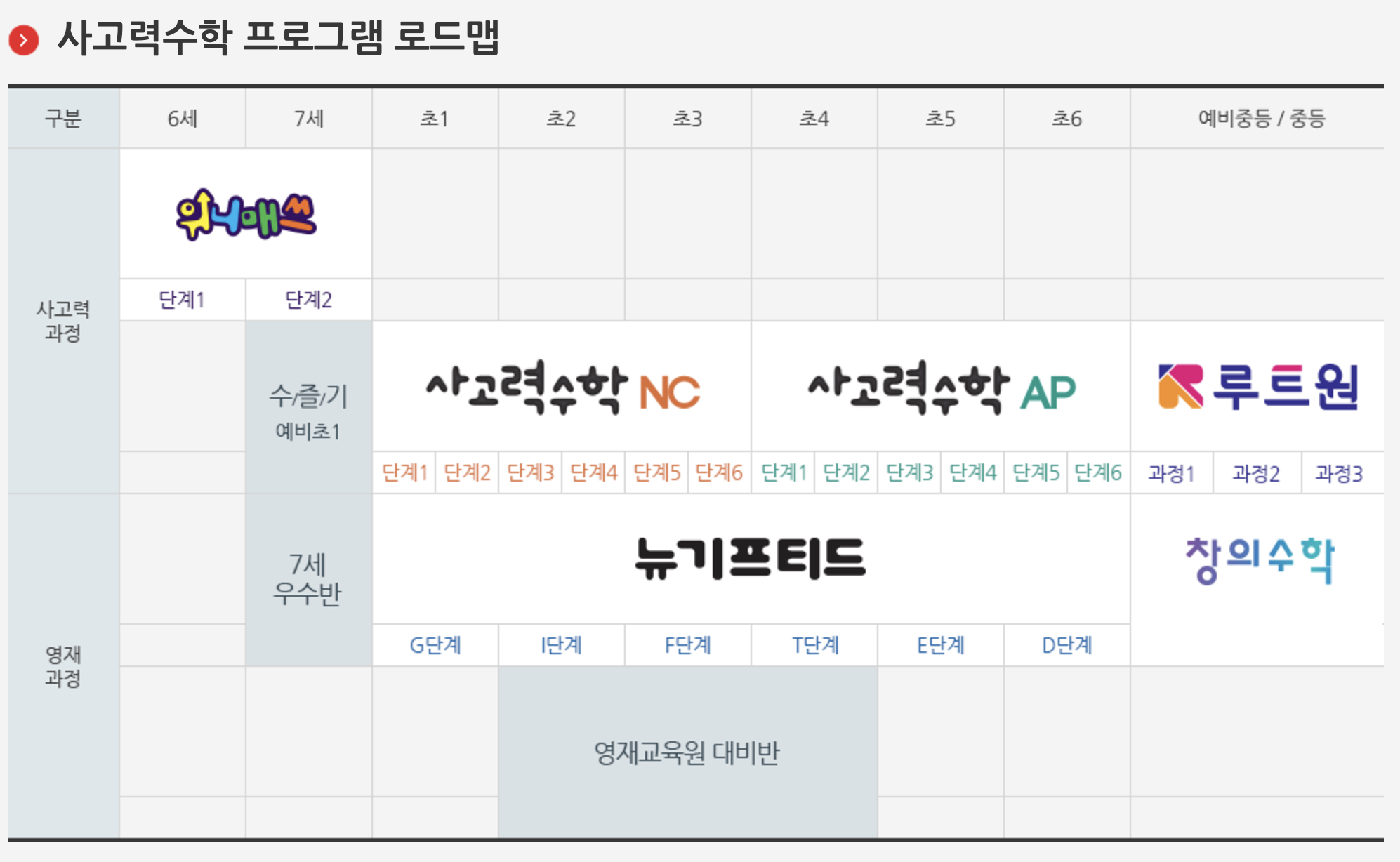 초등 사고력 과정 외에도 중등 과정(빨강중등)까지 커리큘럼이 이어지며, 선행학습을 통해 중학교 진학 후에도 안정적인 학습 환경을 제공합니다.