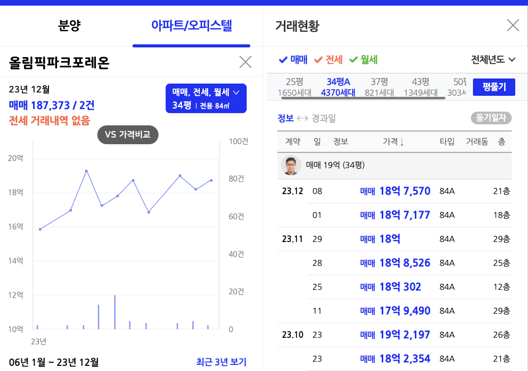아실에서는 입주권 실거래가와 건수를 그래프로 확인 가능합니다. (좌측) 또한 거래일자, 타입, 층 도 모두 확인 가능합니다. (우측)