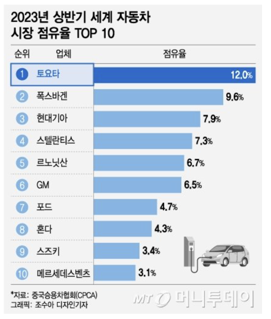 아래는 2023년 상반기 세계 자동차 시장 점유율 TOP 10 인데요, 그럼 1위 업체인 토요타 부터 차례대로 전기차 전환 계획을 알아보도록 하겠습니다.