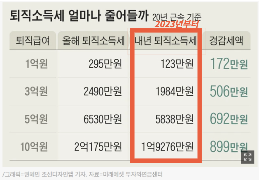 아래 테이블은 작년(2022년) 기사에서 가져왔는데요, 현재 기준으로 내년 퇴직 소득세 금액을 봐주시면 됩니다.