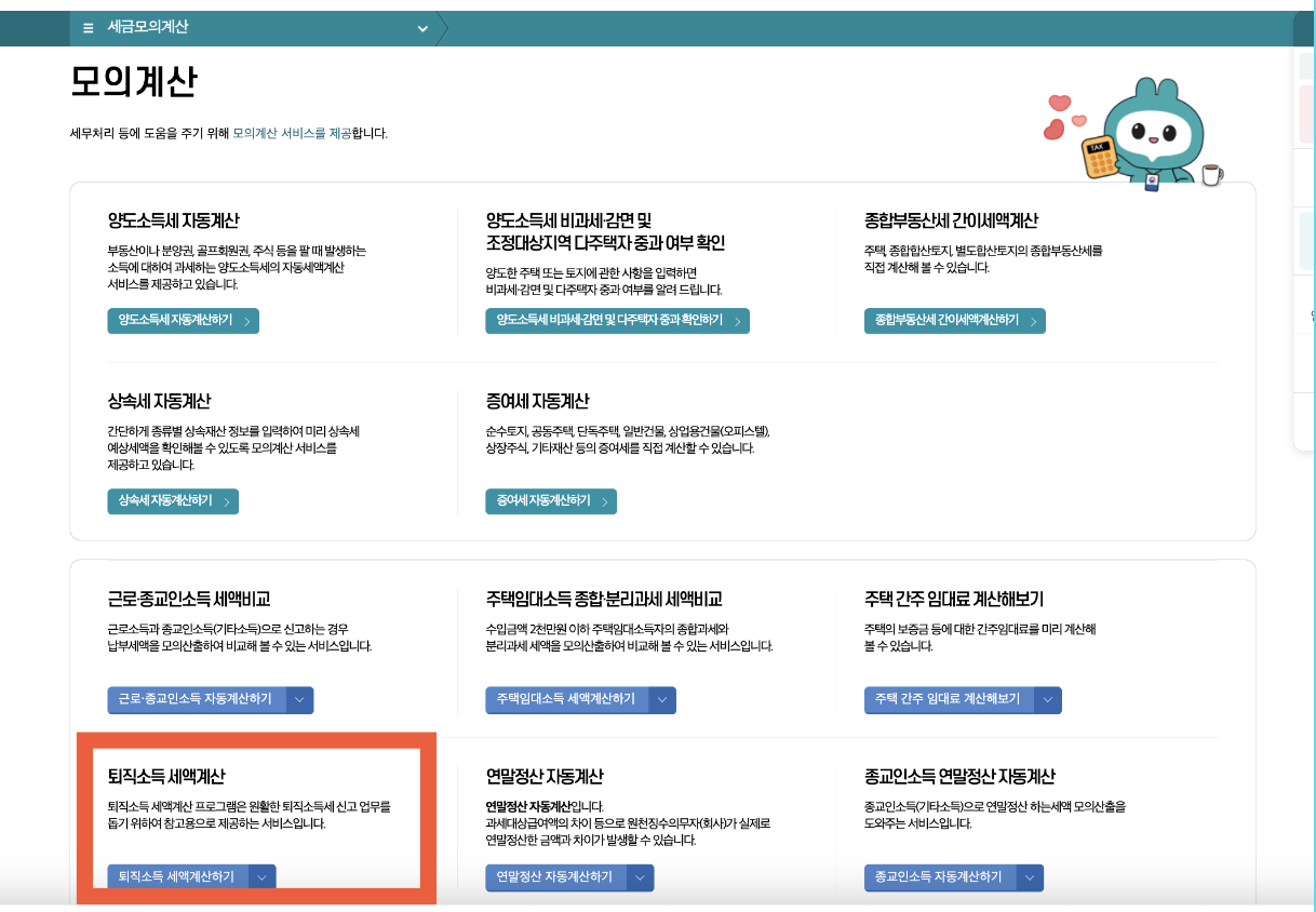 2) 모의계산 페이지에서 "퇴직소득 세액계산"을 클릭합니다.