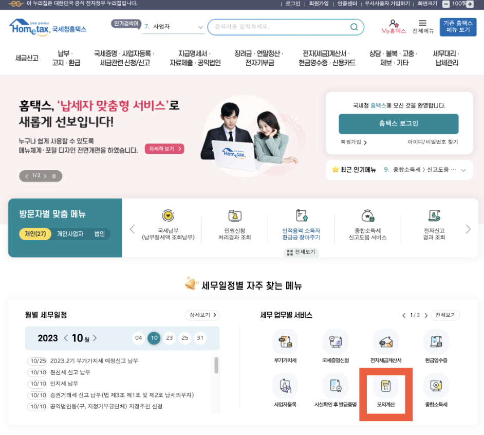 1) 국세청 홈텍스 홈페이지에 접속한 후 우측 하단의 세무업무별 서비스 중 모의계산을 클릭합니다.