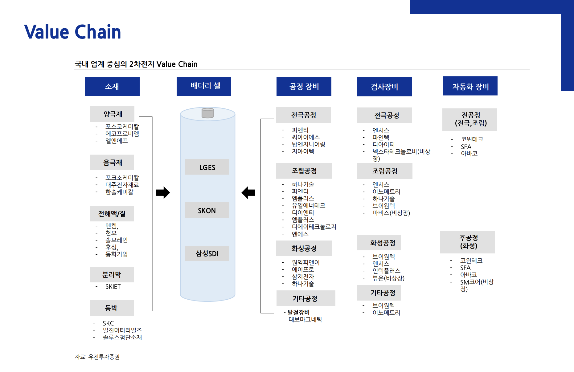 2차 전지 밸류체인에 따른 업체를 유진투자증권에서 정리한 레포트가 있어 함께 소개하고자 합니다.