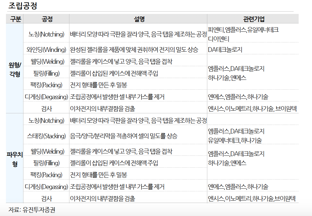 이외 각각의 조립 공정 별 관련 기업은 아래와 같습니다. (출처: 유진투자증권)