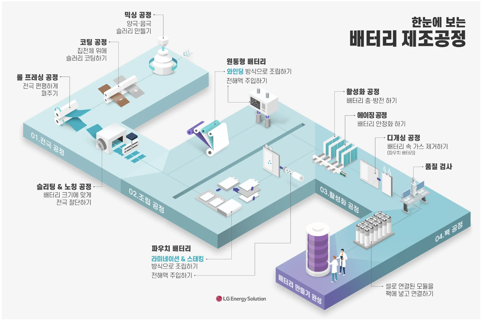 2차 전지 장비업체를 정리하려면 일단 배터리 생산에 어떤 공정들이 있고 어떤 장비들이 들어가는지 먼저 알아봐야 할것 같은데요, 리튬이온배터리의 제조 공정은 <전극 공정 → 조립 공정 → 활성화 공정 → 팩 공정>으로 크게 4단계로 이루어져 있습니다.