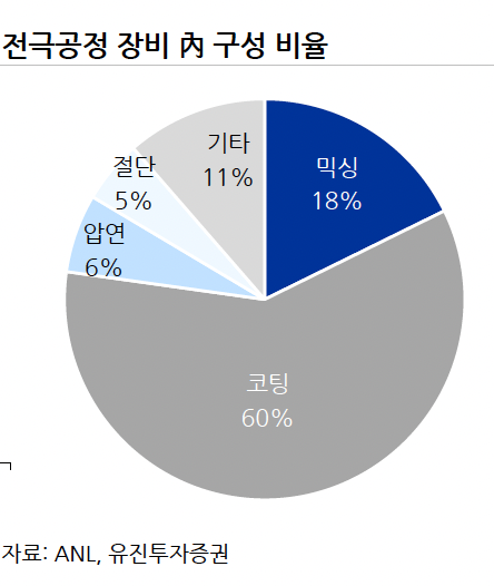 배터리의 양극과 음극을 만드는 핵심 과정인 ‘전극 공정’. 제조공정 Capex의 31%로 가장 큰 부분을 차지합니다.
