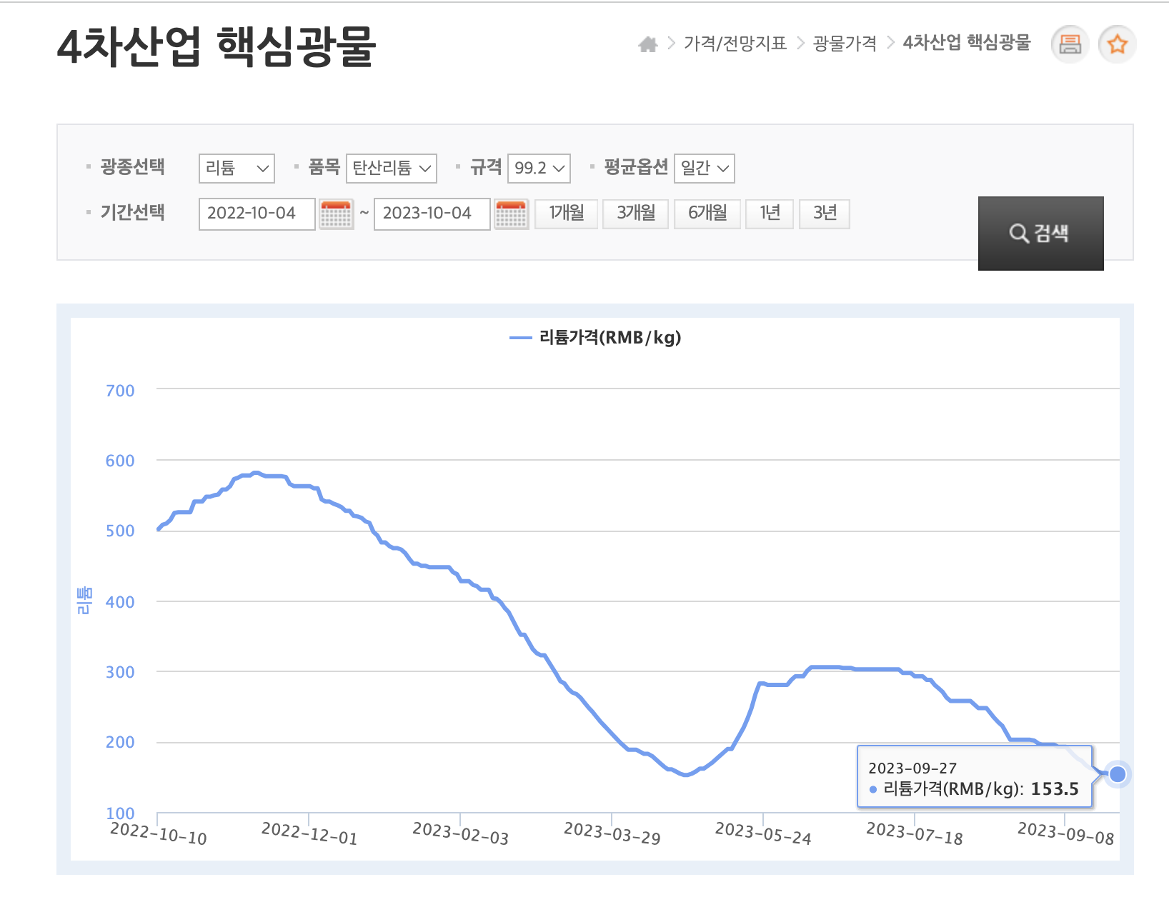 현재 9월 27일자 가격은 153.5 RMB / kg 으로 나오네요. 최근 1년 가격을 조회해 보니 2023년 4월 최저가 152.5 RMB / kg 으로