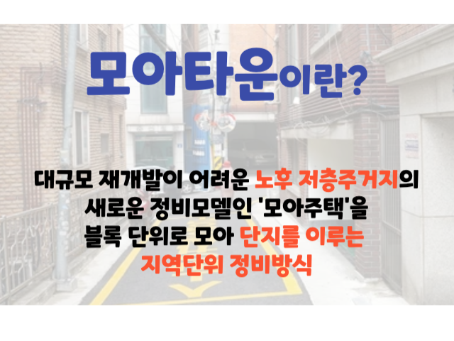 모아타운은 신축과 구축 건물이 혼재돼 있어 대규모 재개발이 어려운 10만㎡ 이내 노후 저층주거지를 하나의 그룹으로 묶어서 대단지 아파트처럼 양질의 주택을 공급하고 지하주차장과 같은 편의시설을 마련을 위한 지역 단위 정비방식입니다.