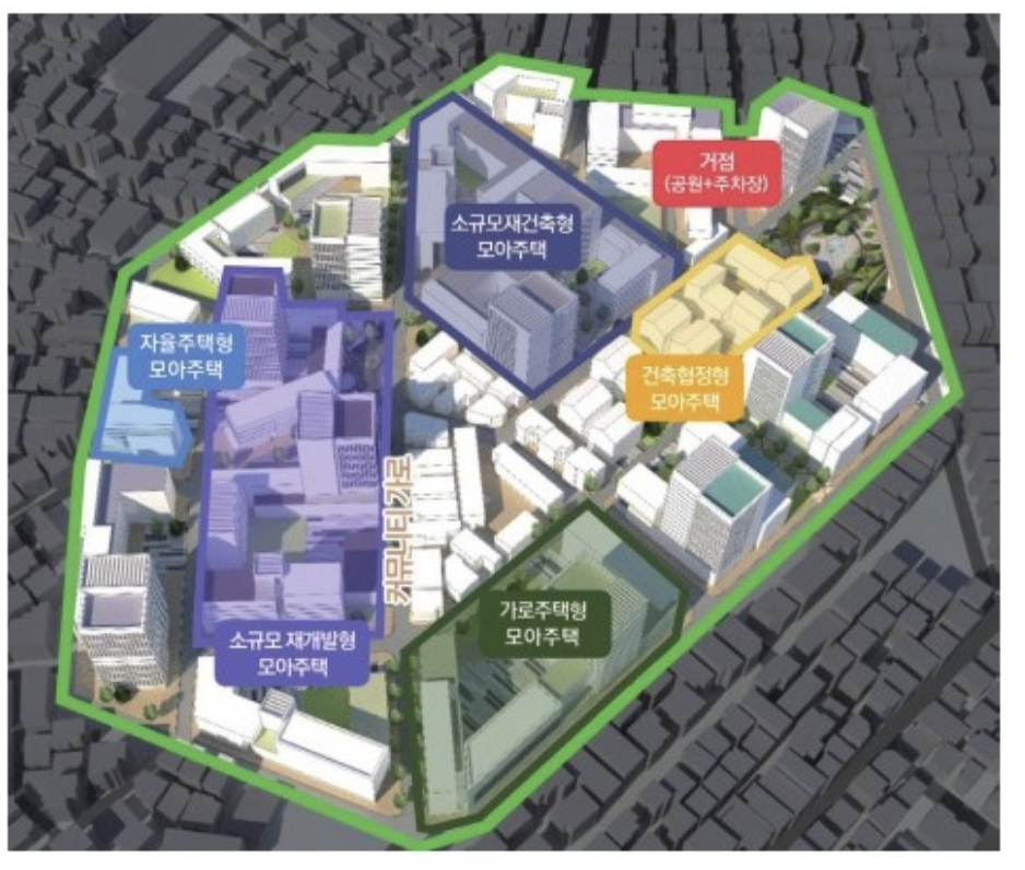 위의 여러 사업유형이 모이게 되면 아래 이미지와 같이 다양한 모아주택들이 모여서 모아 타운을 형성하게 됩니다.