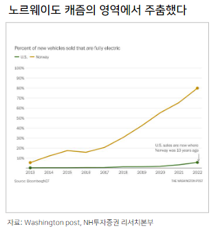 노르웨이의 경우 현재 전기차 침투율이 2023년 10월 누계 기준 90.5%로 세계 1위 인데요, 노르웨이도 2015년 침투율 17%를 기록한 뒤 2016년 둔화기를 거치고 2017년부터 본격적인 성장을 했습니다.