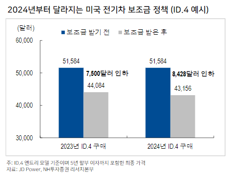 미국은 2024년 1월 1일부터 IRA 보조금 7,500달러를 차량 구매 시 즉시 지급할 계획을 발표한 바 있습니다. 이는할부원금과 이자비용을 낮추는 바 사실상 보조금 약 10% 인상 효과를 가져옵니다.