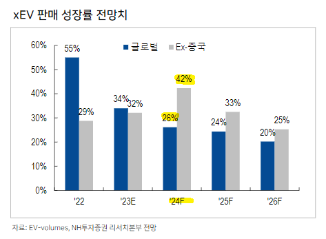 이를 반영한 EV-Volumes 전망치는 2024년 글로벌 1,777만대(+26% y-y), 중국 제외한 글로벌 817만대(+42% y-y) 입니다.